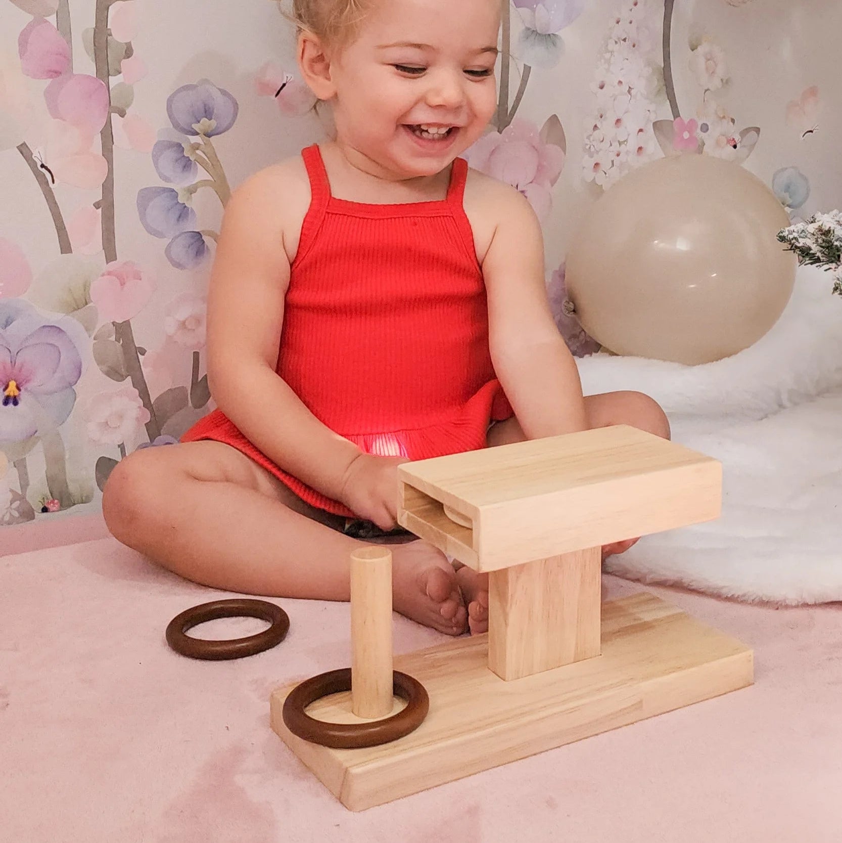 Slide a ring through the slot and watch it journey beneath the platform to pop out the far side, delivering instant, satisfying feedback. The smooth timber pieces encourage a firm pincer grasp, while repeated posting refines hand eye coordination, wrist rotation and logical sequencing.